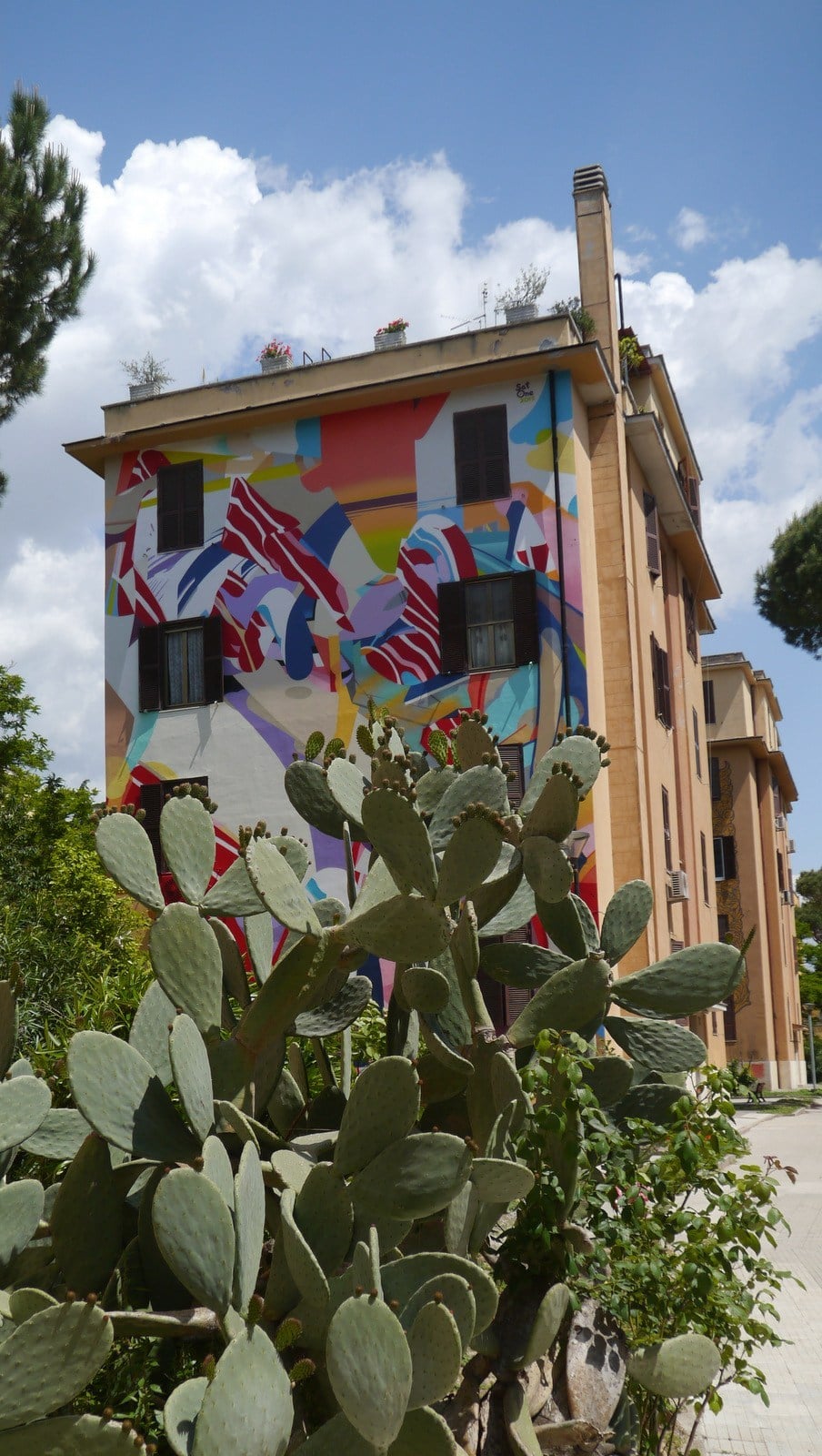 In particular, there is one part of Rome in which the Comune of Rome has not only allowed but encouraged street art to flourish – in an official capacity – and the result is truly stunning. Tor Marancia, a formerly run-down housing project, has been rejuvenated by street art. This poverty-stricken area of government housing, in conjunction with the Comune of Rome’s ‘Big City Life’ project, has had one painting made on each end of each block, painted by street artists from all over the world, resulting in a truly breathtaking experience. Each piece has a plaque identifying the artist and title, and visitors are free to wander through the now rejuvenated housing estate to view the art. A location map provided at the bottom of this page. Click any of the images below to expand them